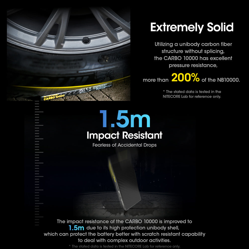 The impact resistance of the CARBO 10000 is improved to 1.5m due to its high protection unibody shell, which can protect the battery better with scratch resistant capability to deal with complex outdoor activities.